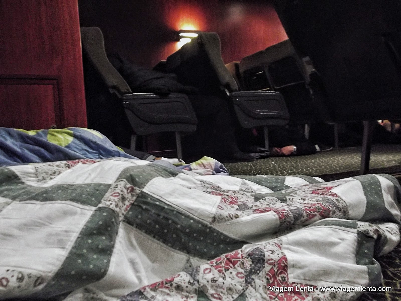 Porém, esses espaços salvaram minha noite. As poltronas, apesar de confortáveis, não permitem que se remova o braço, largo, no seu meio. E para quem não consegue dormir sentado, complica demais. Com o barco relativamente vazio, fui andar um pouco por volta da meia-noite e vi um monte de pessoas dormindo no chão, no carpete de vários ambientes. Não deu outra. Achei um canto, peguei meu saco de dormir e o travesseiro inflável e curti o carpete do navio. Foi mais do que suficiente para dormir boas horas de sono.